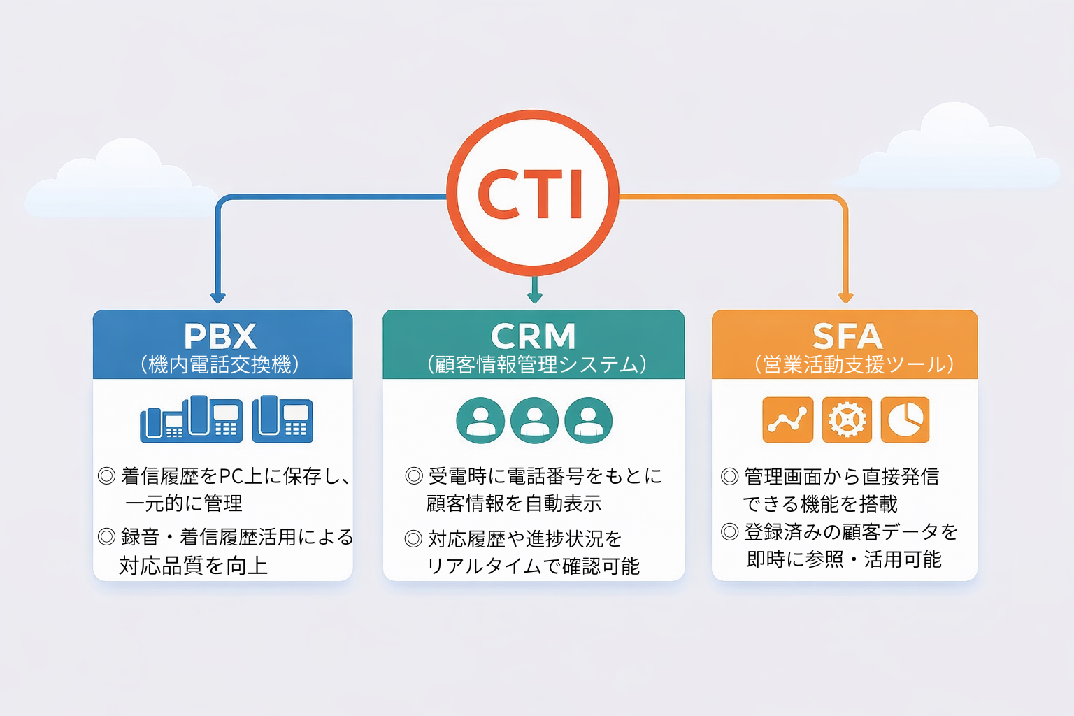 ここからは、CTI連携への理解を深めるために以下の3項目に分けて解説していきます。