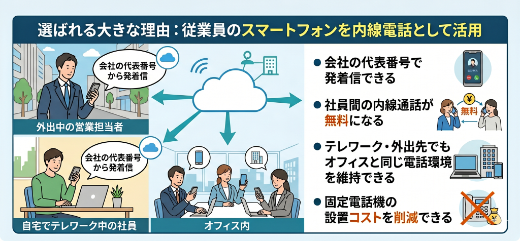 クラウドPBXが選ばれる大きな理由は、従業員のスマートフォンを内線電話として活用できるからです。外出中の営業担当者も、自宅でテレワーク中の社員も、会社の代表番号から発着信できます。