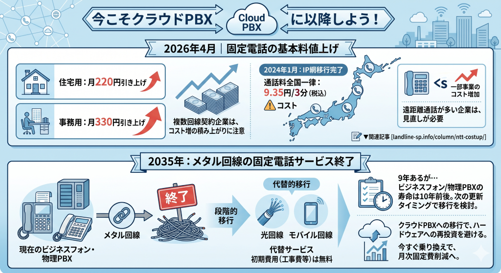 現在のビジネスフォンや物理PBXがメタル回線に依存している場合、2035年までに何らかの移行が必要になります。