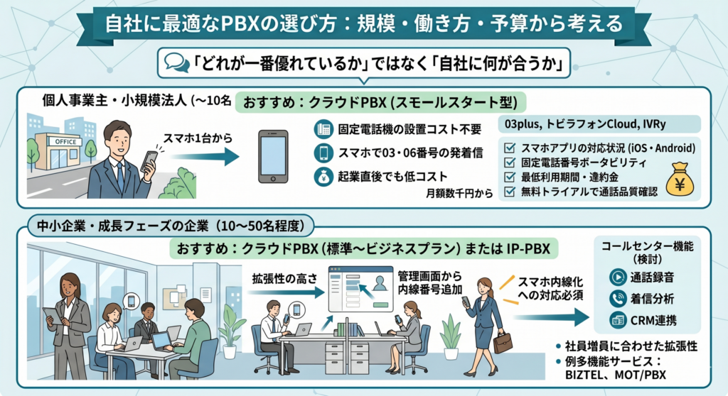 PBXの選び方は、企業の規模・働き方・予算によって大きく異なります。「どれが一番優れているか」ではなく「自社の状況に何が合うか」という視点で考えることが大切です。