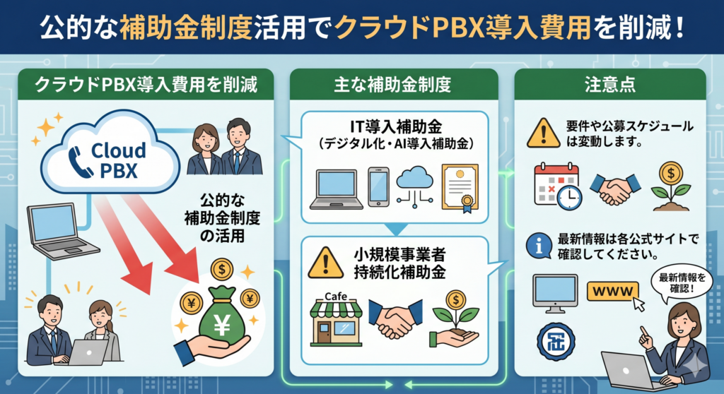 公的な補助金制度を活用すれば、クラウドPBXの導入費用を削減できる場合があります。要件や公募スケジュールは変わるため、最新情報は各公式サイトで確認してください。
